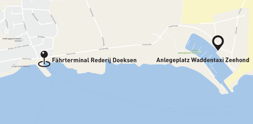 - Rederij Doeksen ermöglicht die Dienstleistungen des Wattentaxis: über unsere Website können Sie die Abfahrten buchen. Für weitere Informationen und die allgemeinen Geschäftsbedingungen verweisen wir Sie auf die Internetseite von Waddentaxi.nl (NL).